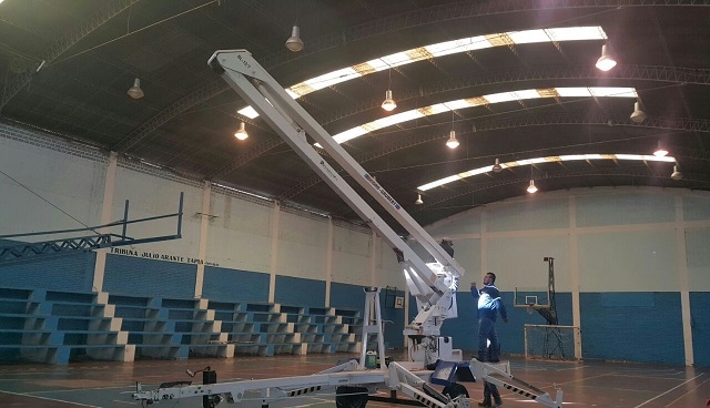 De las 18 luminarias del tinglado Municipal, sólo 8 estaban funcionando. Esta mañana comenzó con el recambio de las mismas para una mejor visión sobre todo en los partidos que se disputan de noche como vóley y el hanball ya que el basquet no se practica en estas instalaciones por la falta del acrílico que se rompió en el mes de enero.