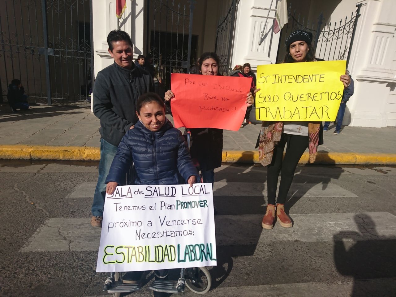 Estas personas se manifestaron con carteles que explican su actual situación. Pertenecen al plan “Promover” y prestan servicios en la Secretaría de Salud del municipio.