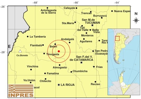 Epicentro: 121 Km. al NO de San F. Del Valle De Catamarca, 160 Km. al N de La Rioja, 39 Km. al SE de Belén. -27.965 (lat) -66.846 (long)