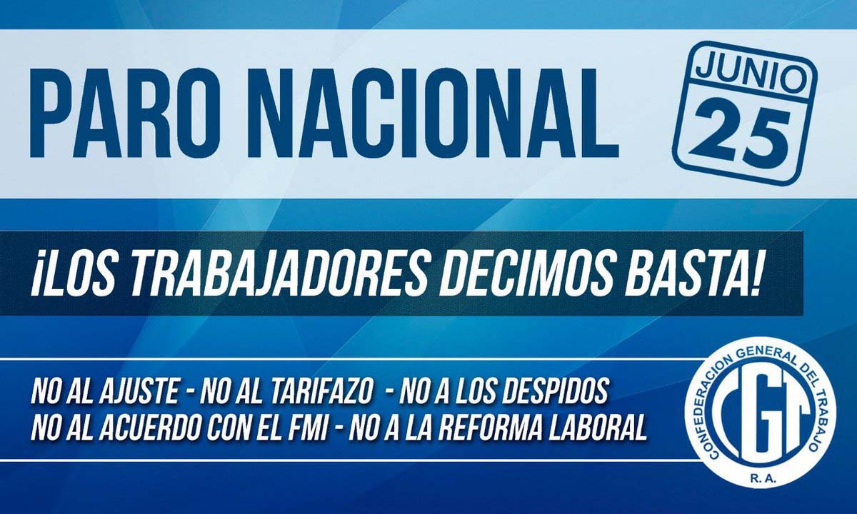 El Consejo Directivo de la Confederación General del Trabajo luego de un profundo debate, habiendo insistido frente a las autoridades del gobierno nacional sobre la necesidad de efectuar cambios en el rumbo de la política económica, luego de advertir sobre los efectos sociales del brutal ajuste y no haber recibido respuestas adecuadas a los reclamos, resuelve declarar un paro nacional de actividades, sin movilización, por 24 horas el día 25 de junio.