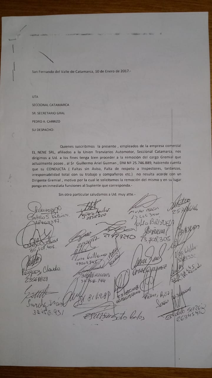 Lo cierto es que según data de enero del año pasado, un grupo de empleados enviaron una nota al secretario general de la UTA por ese entonces, Pedro Armando Carrizo, a quien le pidieron que Guzmán sea apartado del gremio.
