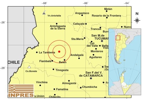 Epicentro: 199 Km. al NO de San F. Del Valle De Catamarca, 213 Km. al O de San Miguel De Tucumán, 48 Km. al NO de Belén. -27.289 (lat) -67.281 (long)