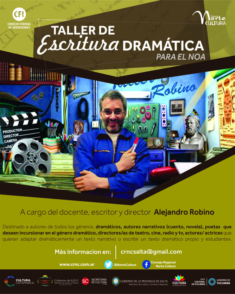 Esta propuesta organizada de manera conjunta entre el Consejo Regional Norte Cultura y el Consejo Federal de Inversiones (CFI), tiene por intención transmitir herramientas técnicas de escritura dramática; facilitar una metodología de análisis de textos dramáticos para afrontar su reescritura con éxito, y acompañar durante la realización del taller la producción de textos dramáticos breves.
