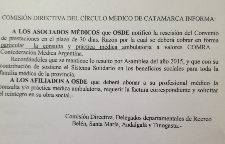 Esta situación no sólo se registra en Catamarca, ya que en Santiago del Estero, OSDE también rescindió el convenio con el Colegio de Médicos de esa provincia.