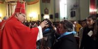 Ya en el centro de la ciudad, la columna dio vueltas a la plaza 25 de Mayo e ingresó al Santuario, donde se llevó a cabo la Misa presidida por el Obispo Diocesano, Mons. Luis Urbanc, y concelebrada por los Pbros. Héctor Salas y Ángel Nieva, durante la cual, casi 200 adolescentes y adultos recibieron los dones del Espíritu Santo a través del Sacramento de la Confirmación.