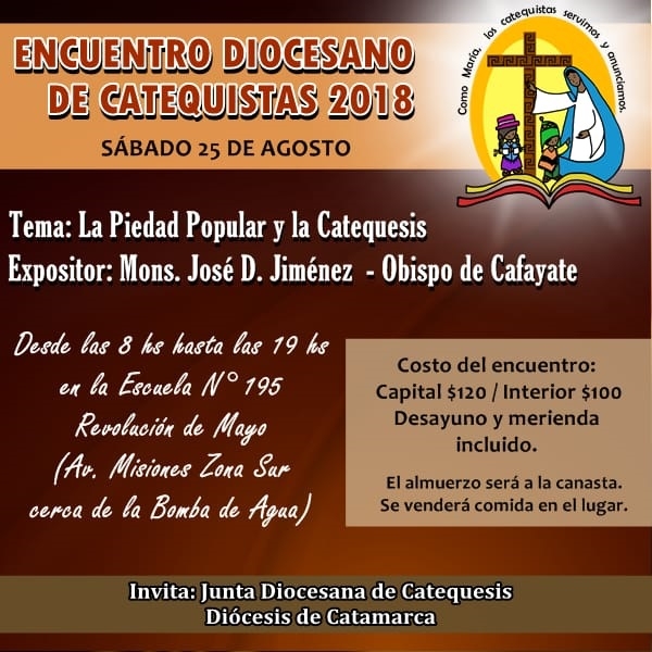 El expositor será Mons. José Demetrio Jiménez, Obispo de la Prelatura de Cafayate, quien abordará el tema “La piedad popular y la catequesis”, en correspondencia con el eje de reflexión de este Año Diocesano de la Piedad Popular, camino al Jubileo por los 400 años del hallazgo de la Imagen de la Virgen del Valle.