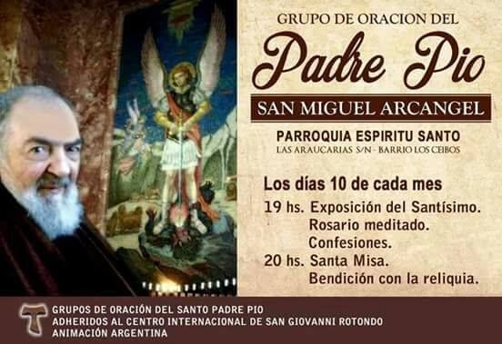 El Grupo de Oración del Padre Pío “San Miguel Arcángel” invita a la exposición del Santísimo, a las 19, Rosario meditado y confesiones; y a las 20 a la Santa Misa y bendición con la reliquia.