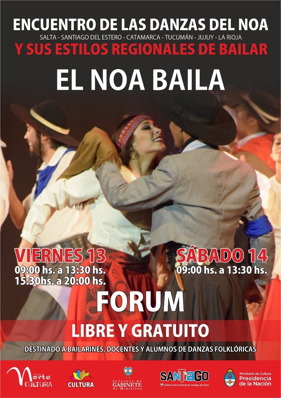 Con la coordinación de la Subsecretaría de Cultura, se realizará este viernes 13 y sábado 14, en Santiago del Estero, el Primer Encuentro de Danzas del NOA y sus estilos regionales de bailar, denominado “NOA baila”, el mismo está impulsado por el Consejo Regional Norte Cultura, con el apoyo del Ministerio de Cultura de la Nación.