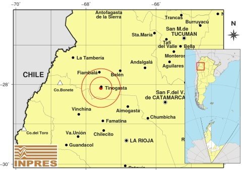 Epicentro: 163 Km. al NO de La Rioja, 184 Km. al O de San F. Del Valle De Catamarca, 4 Km. al S de Tinogasta. -28.092 (lat) -67.574 (long)
