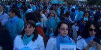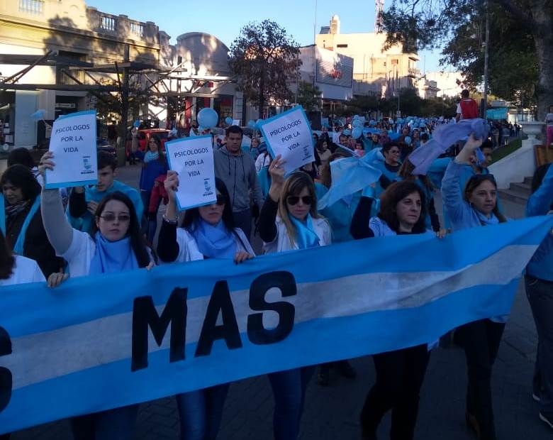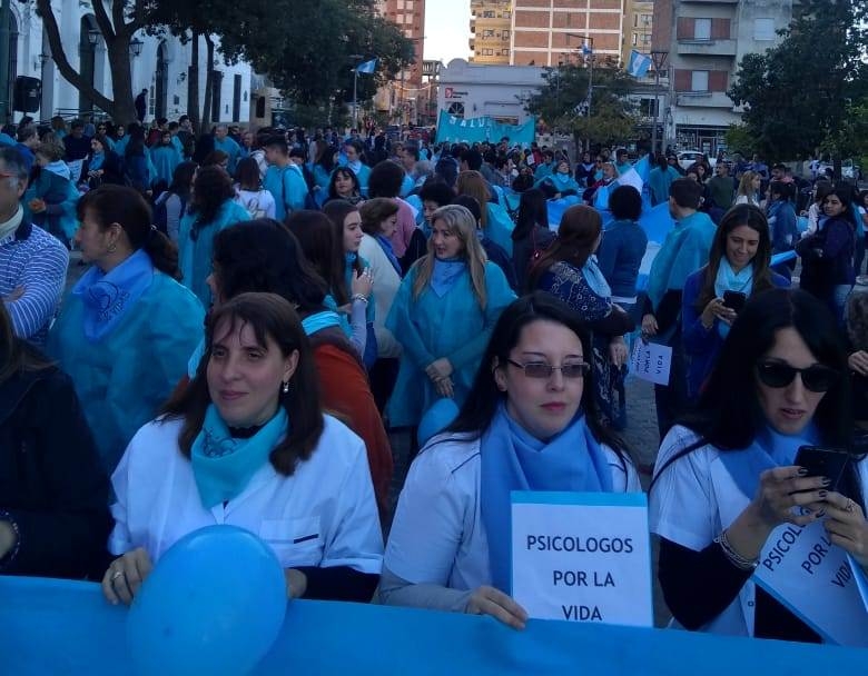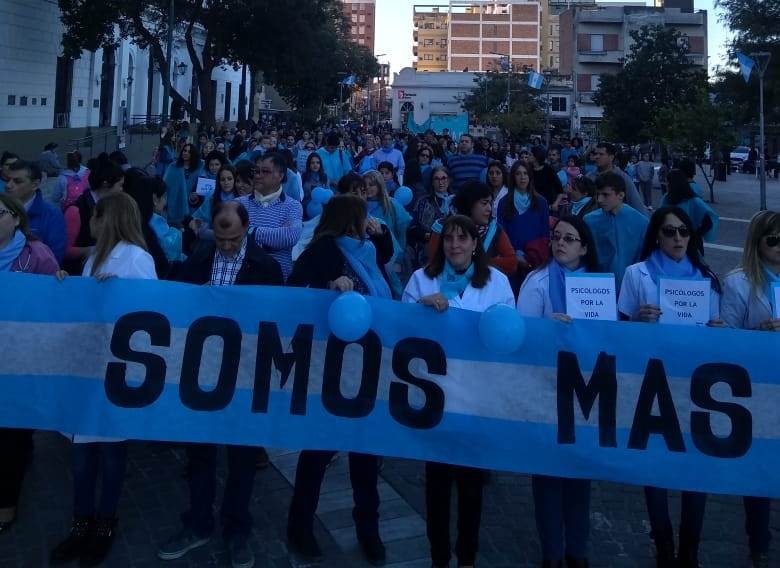 Los participantes se concentraron frente a la Plazoleta de la Bandera y caminaron alrededor de la plaza 25 de Mayo, con pañuelos y globos celestes, y consignas a favor de la vida.