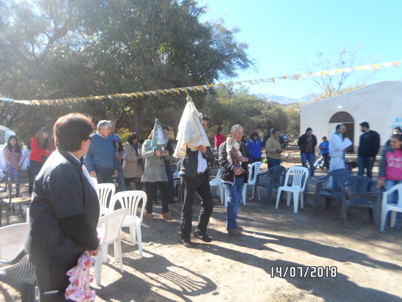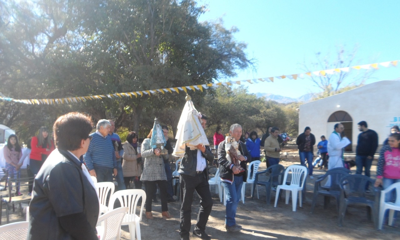 Los feligreses se reunieron en la explanada del antiguo edificio de la escuela, que está siendo refaccionado para capilla de la localidad, por iniciativa de los vecinos del lugar. Algunas familias llevaron las imágenes que son veneradas en sus hogares.