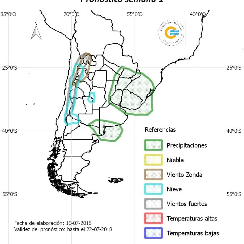 En el área de cobertura continuarán soplando vientos del sector oeste con velocidades entre 70 y 110 km/h con ráfagas. No se descarta la ocurrencia de viento blanco en las zonas cordilleranas de Mendoza, de San Juan y del norte de Neuquén. Además puede registrarse viento zonda en las zonas precordilleranas de San Juan y La Rioja, y oeste de Catamarca. Las condiciones se mantendrán al menos hasta el día jueves 19.