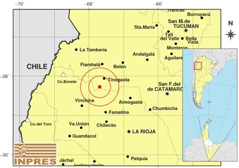 Epicentro: 151 Km. al NO de La Rioja, 192 Km. al O de San F. Del Valle De Catamarca, 27 Km. al SO de Tinogasta. -28.275 (lat) -67.692 (long)
