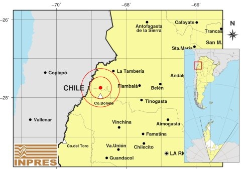 Epicentro: 262 Km. al NO de La Rioja, 305 Km. al O de San F. Del Valle De Catamarca, 60 Km. al SO de La Tambería. -27.748 (lat) -68.738 (long)