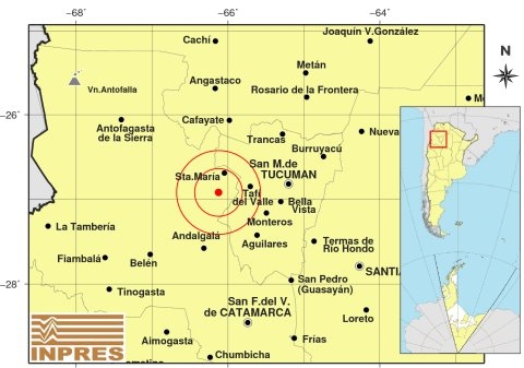 Epicentro: 93 Km. al O de San Miguel De Tucumán, 173 km al N de San F. Del Valle De Catamarca, 27 Km. al S de Sta. María. -26.923 (lat) -66.124 (long)