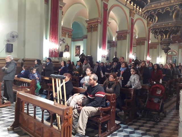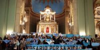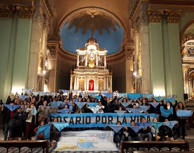 La iniciativa nacida de un grupo de laicos, reúne cada sábado a familias, niños, jóvenes y adultos, quienes comparten un momento de oración profunda, haciendo presente la intención a favor de las dos vidas. Distribuidos en la nave central y en laterales de la Catedral Basílica y Santuario de Nuestra Señora del Valle, con pañuelos celestes y el Rosario en sus manos, meditaron los Misterios de Gozo, correspondientes al día, intercalado cada uno de ellos con cantos de alabanza a Dios y a la Virgen Santísima.