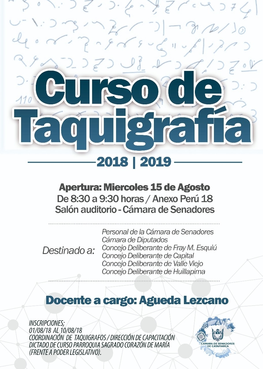La apertura de dicha capacitación que estará a cargo de la Taquígrafa Águeda Lezcano, se realizará el próximo 15 de agosto a las 8.30 en el Salón Auditorio instalado en el Anexo de la Cámara de Senadores, sito en calle Perú N°18; en tanto que, el dictado del curso será en la Salón de la Parroquia Sagrado Corazón de María.