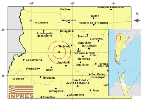 Epicentro: 145 Km. al O de San Miguel De Tucumán, 184 Km. al NO de San F. Del Valle De Catamarca, 69 Km. al SO de Sta. María. -26.993 (lat) -66.645 (long)