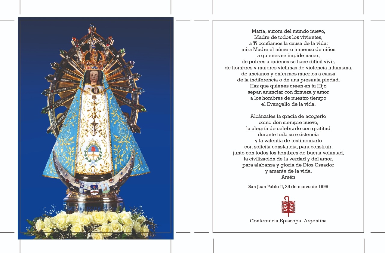 La oración elegida fue extraída de la encíclica Evangelium Vitae (Evangelio de la Vida), de San Juan Pablo II, y se rezará al término de la misa, que presidirá el obispo de San Isidro y presidente de la Conferencia Episcopal Argentina, Mons. Oscar Ojea, y concelebrarán prelados, entre ellos el Obispo de Catamarca, Mons. Luis Urbanc, y sacerdotes de todo el país.