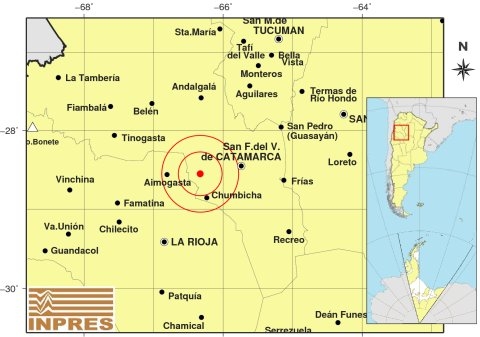 Epicentro: 59 Km. al O de San F. Del Valle De Catamarca; 108 Km. al NE de La Rioja; 35 Km. al N de Chumbicha -28.550 (lat) -66.330 (long)