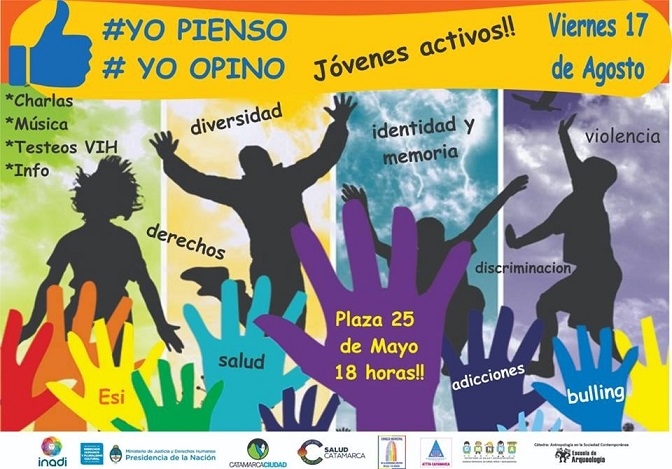 Como resultado de esta coordinación, se realizará el día viernes 17 de agosto, a las 18 horas, una jornada con las y los jovenes catamarqueños llamada" #YoPienso #YoOpino Jóvenes Activos" en la Plaza 25 de Mayo, donde se alentara el dialogo en grupos sobre las temáticas que los atraviesan a diario, tales como bulling, Educacion sexual integral, diversidad sexual, embarazo adolescente, VIH Sida, entre otros.