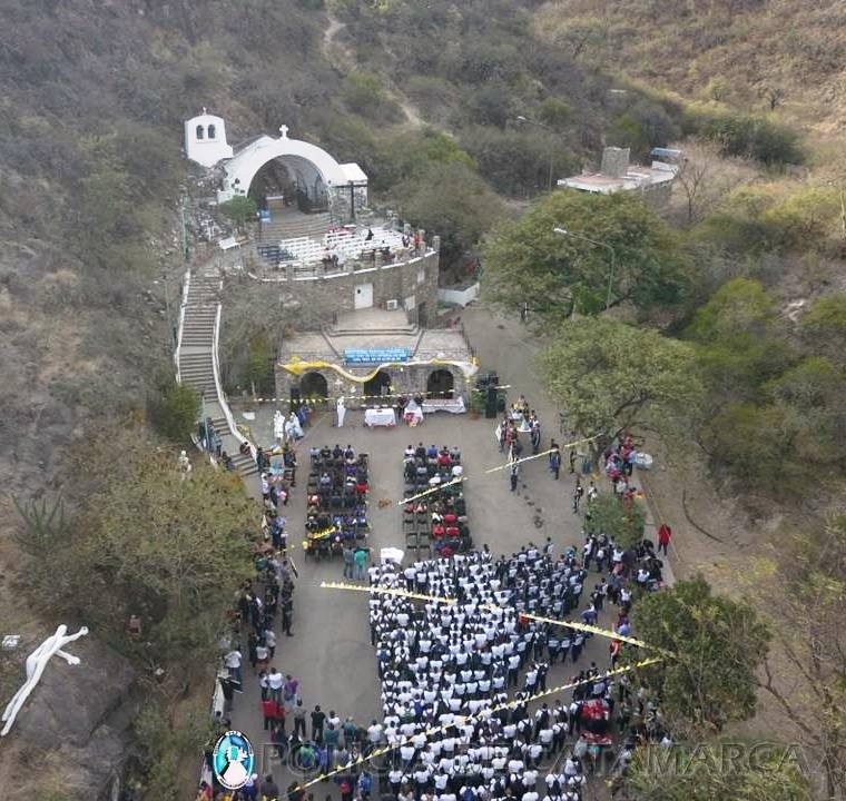 En la Gruta de la Morena del Valle, el Capellán Mayor Of. Inspector Pbro. Humberto Carrizo, ofició la Santa Misa; este año con un colorido particular, ya que los efectivos policiales trasladaron en andas las imágenes de la Virgen del Valle y de San José que están en las grutas de las distintas dependencias y se encolumnaron para peregrinar hasta los Pies de María.