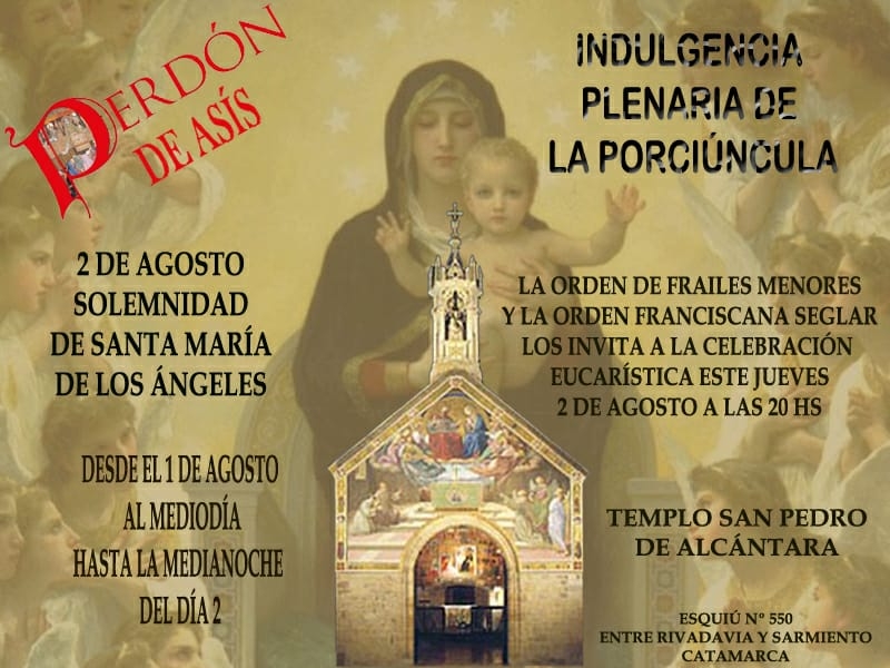 La Orden de los Frailes Menores y la Orden Franciscana Seglar invitan a la celebración eucarística, que se llevará a cabo el jueves 2 de agosto, Solemnidad de Santa María de los Ángeles, a las 20, en el templo franciscano de San Pedro de Alcántara, ubicado en Esquiú 550 entre Rivadavia y Sarmiento. Este día se puede recibir la indulgencia plenaria de la Porciúncula, o perdón de Asís.