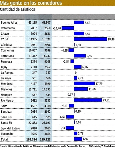 Según la estadística que remitió la semana pasada a este diario la Dirección Nacional de Políticas Alimentarias como respuesta a un pedido de acceso a la información, durante el mismo mes en la provincia de Buenos Aires, unos 446 comedores comunitarios recibieron a 68.507. A fin del año pasado, habían sido 63.165. Implica un 8,4% de aumento, por encima del promedio nacional.