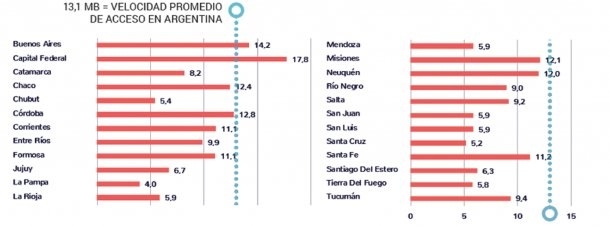 En el extremo opuesto, La Pampa (4 MB), Santa Cruz (5,2 MB) y Chubut (5,4 MB) son las tres provincias con los promedios de velocidad más bajos.