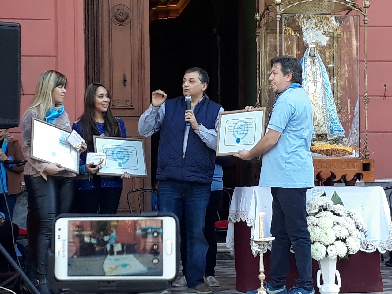 Al finalizar la oración, representantes del Grupo de Laicos hizo entrega de reconocimientos a los profesionales que expusieron en el Congreso de la Nación en defensa de la vida: la Lic. Roxana Díaz Vergara, la Dra. Ivana Andrea Agüero Pacheco y Dr. Edgardo Varela.