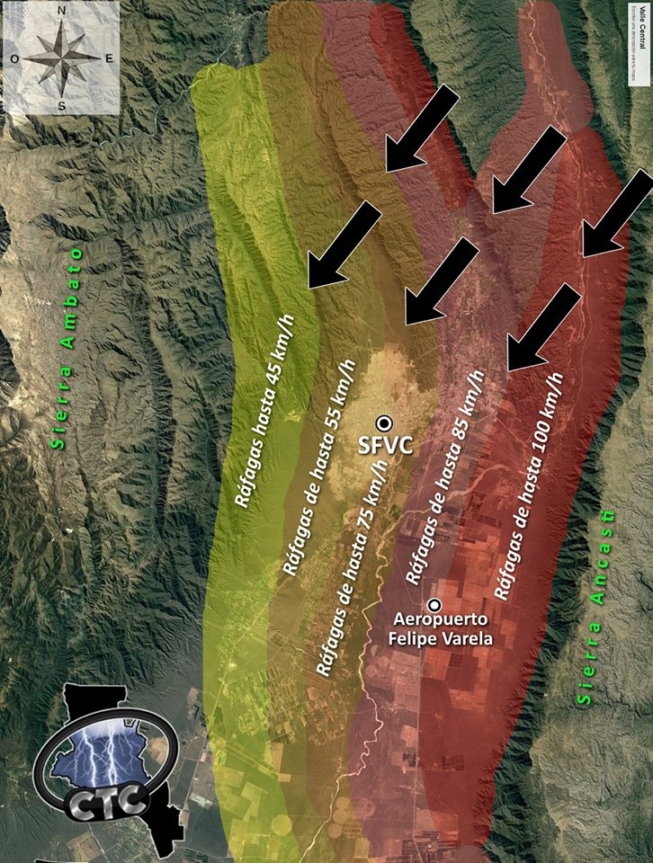 La cuestión es que el viento no tiene la misma velocidad en todos lados. Aquellos lugares del valle que se encuentren más cerca de la sierra Ancasti o la sierra Gracián, recibirán ráfagas mucho más fuertes que los lugares que se encuentran cerca de la sierra Ambato.