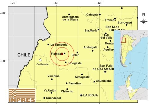 Epicentro: 207 Km. al NO de La Rioja; 212 Km. al NO de San F. Del Valle De Catamarca; 12 Km. al O de Fiambalá -27.715 (lat) -67.729 (long)