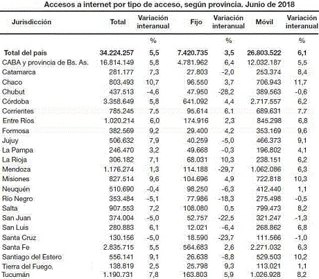 En el segundo trimestre de 2018, según datos difundidos por el INDEC, se registraron 7.400.805 accesos a internet fijo. Esto significó 3,3% de aumento respecto al segundo trimestre de 2017. Por otro lado, los accesos fijos residenciales crecieron 4,0%: alcanzaron los 6.842.419. Y los accesos fijos de organizaciones sumaron 558.387, con una caída de 3,7%.