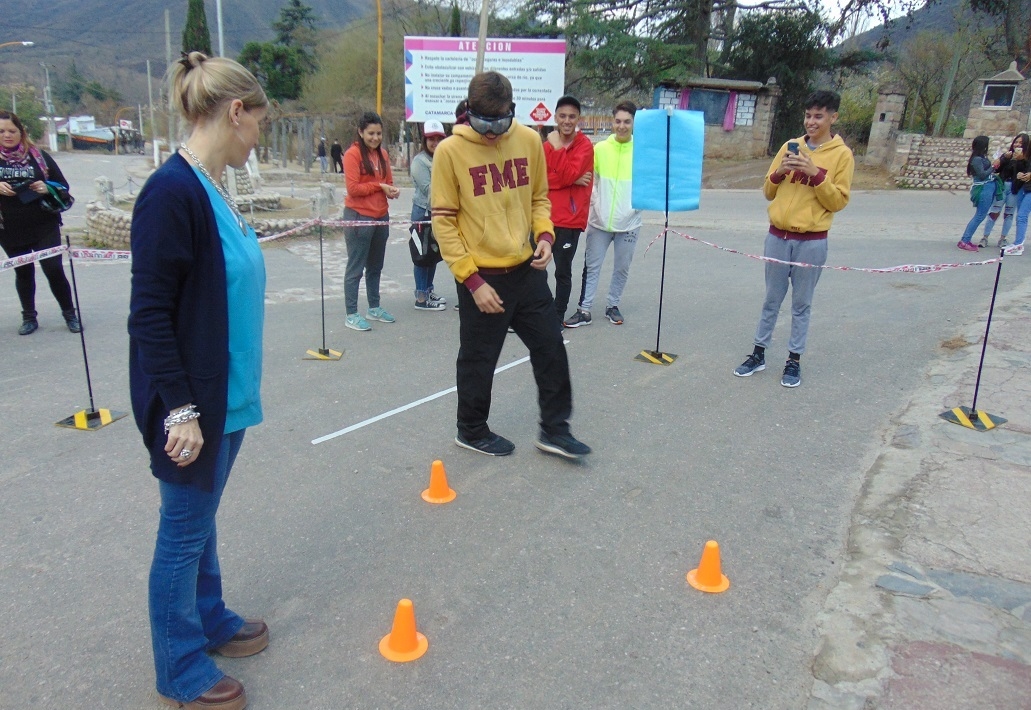 Se diseñó un circuito con diferentes actividades, como eludir conos de plástico y el armado de una pirámide o un rompecabezas básico, donde los jóvenes hacen primero el recorrido para luego repetirlo usando las gafas.
