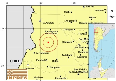 Epicentro: 232 Km. al O de San Miguel De Tucumán; 258 Km. al NO de San F. Del Valle De Catamarca; 79 Km. al S de Antofagasta De La Sierra -26.756 (lat) -67.527 (long)