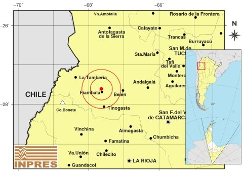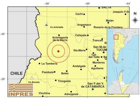 Epicentro: 222 Km. al O de San Miguel De Tucumán; 250 Km. al NO de San F. Del Valle De Catamarca; 81 Km. al S de Antofagasta De La Sierra -26.778 (lat) -67.435 (long)