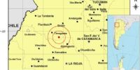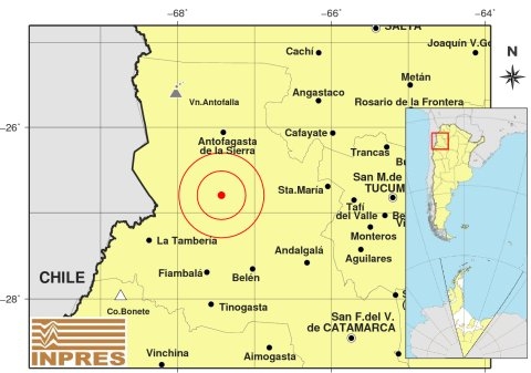 Epicentro: 222 Km. al O de San Miguel De Tucumán; 248 Km. al NO de San F. Del Valle De Catamarca; 83 Km. al S de Antofagasta De La Sierra -26.796 (lat) -67.429 (long)