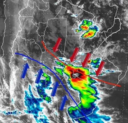 En la imagen satelital pueden ver un frente cálido y húmedo (marcado en rojo) provocando tormentas en zonas de Santa Fe y Entre Ríos, mientras que desde el sur se aproxima un nuevo frente frío (marcado en azul).