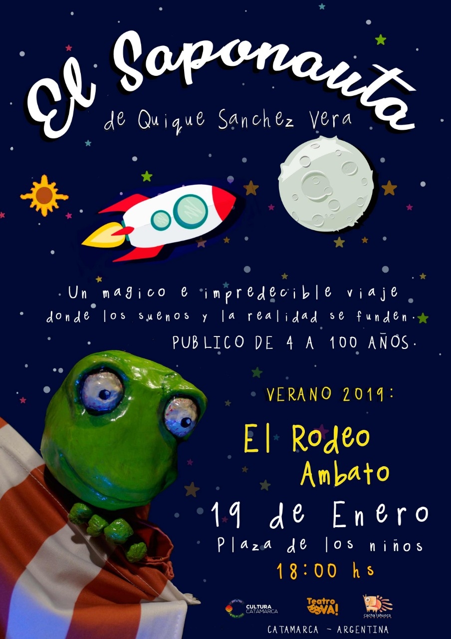 Con la intención de acercar el teatro a la gente y colaborar con la difusión del trabajo de tantos artistas locales de teatro independiente, “Teatro Va” –ya en su cuarta edición- continuará este sábado 19 de enero en El Rodeo, departamento Ambato, donde el público podrá presenciar la obra “El Saponauta” a cargo del grupo Cachalahueca. La cita será en la Plaza de los Niños, a partir de las 18.00.