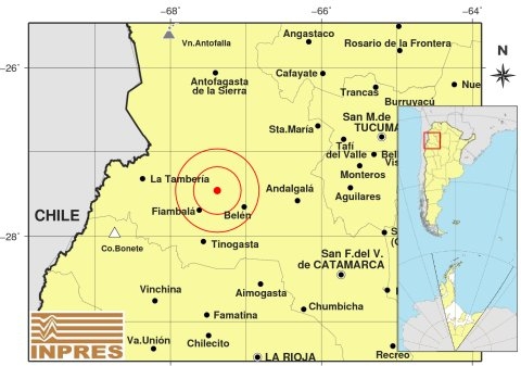 Epicentro: 117 Km. al NO de San F. Del Valle De Catamarca; 168 Km. al N de La Rioja; 38 Km. al SE de Belén -27.900 (lat) -66.754 (long)