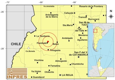 Epicentro: 203 Km. al NO de San F. Del Valle De Catamarca; 211 Km. al N de La Rioja; 8 Km. al NE de Fiambalá -27.622 (lat) -67.579 (long)