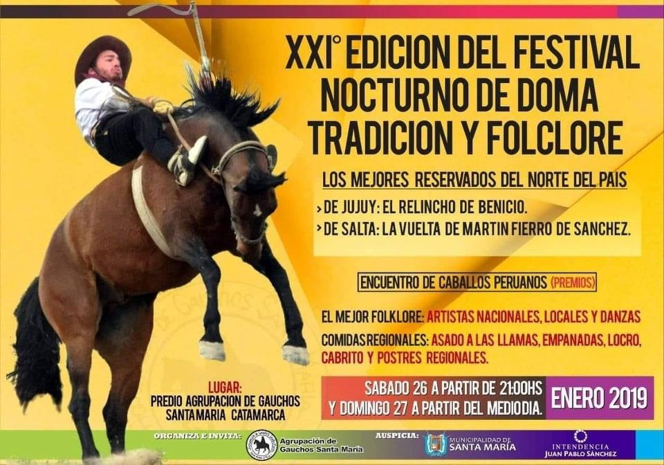 Acompañado con el mejor folklore, con la presentación de artistas nacionales y locales, danzas, comidas regionales y mucho más, se llevará a cabo una nueva edición del Festival Nocturno de Doma, Tradición y Folclore, en el predio Agrupación de Gauchos, en Santa María.
