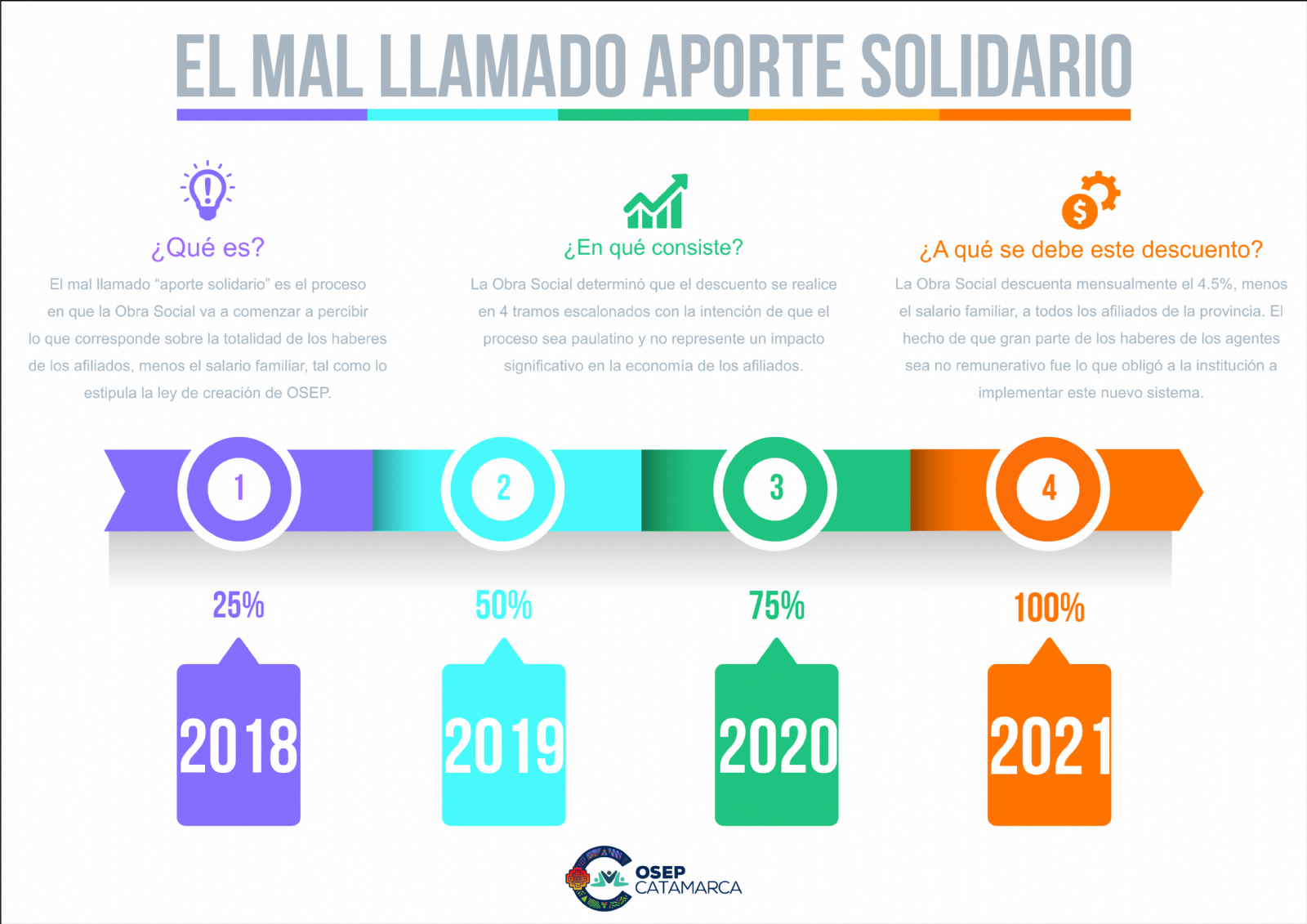 El mal llamado “aporte solidario” es el nombre que se le dio al proceso en que la Obra Social va a comenzar a percibir ingresos sobre la totalidad del sueldo de los afiliados, menos el salario familiar, tal como lo estipula la ley de creación de OSEP, sin importar si estos son remunerativos o no.