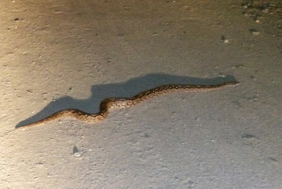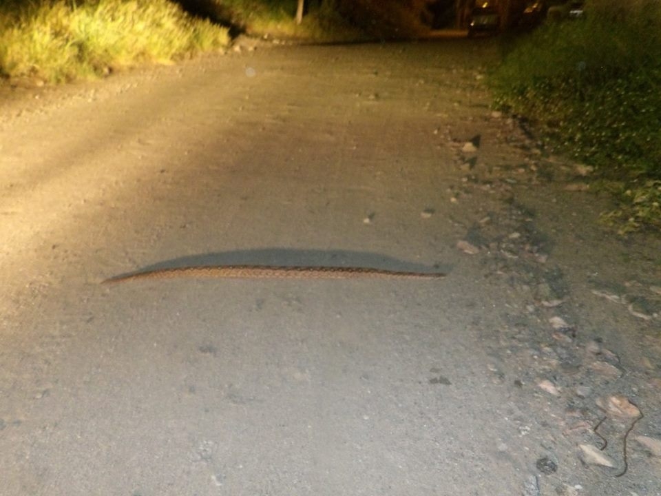En la noche de este lunes, una "lampalagua pichón" e inofensiva, fue encontrada por Martín Ramayo, quien de forma inmediata la atrapó y entregó al organismo competente, a fin de que sea liberada por personal de Flora y Fauna. (Facebook Raúl Fernández).