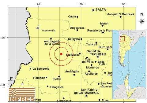 Epicentro: 172 Km. al O de San Miguel De Tucumán; 226 Km. al NO de San F. Del Valle De Catamarca; 87 Km. al SE de Antofagasta De La Sierra -26.700 (lat) -66.919 (long)