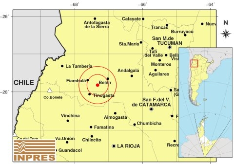 Epicentro: 130 Km. al NO de San F. Del Valle De Catamarca; 169 Km. al N de La Rioja; 29 Km. al SE de Belén -27.886 (lat) -66.904 (long)