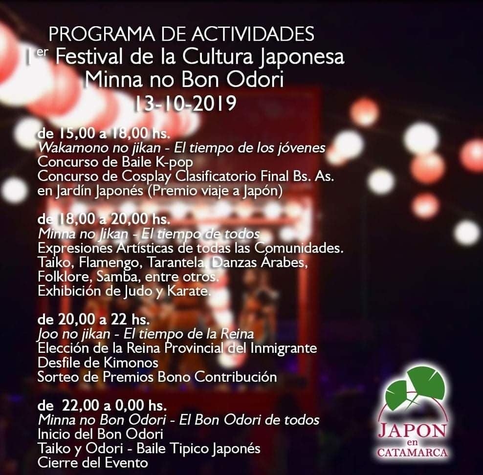 Organizado por la asociación civil Japón en Catamarca y producido por DC Productora, el festival invita a conocer la cultura japonesa a través de su danza, su arte, su música, sus instrumentos, su vestuario y, por supuesto, también su gastronomía. Como invitado de honor estará presente, participando de la jornada, el cónsul de Japón en Argentina Yoshikazu Furukawa.