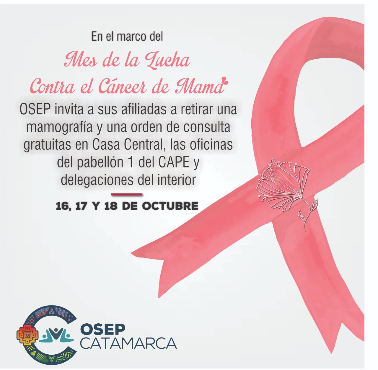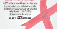 La Obra Social de los Empleados Públicos (OSEP) llevará adelante una serie de acciones enmarcadas en la Campaña Contra el Cáncer de Mama, en consonancia con lo establecido por la Organización Mundial de la Salud (OMS) que declara a octubre como el mes de sensibilización sobre el Cáncer de Mama. OSEP entregará un bono gratuito de mamografía para todas las afiliadas mayores de 40 años junto con una consulta médica para su control.