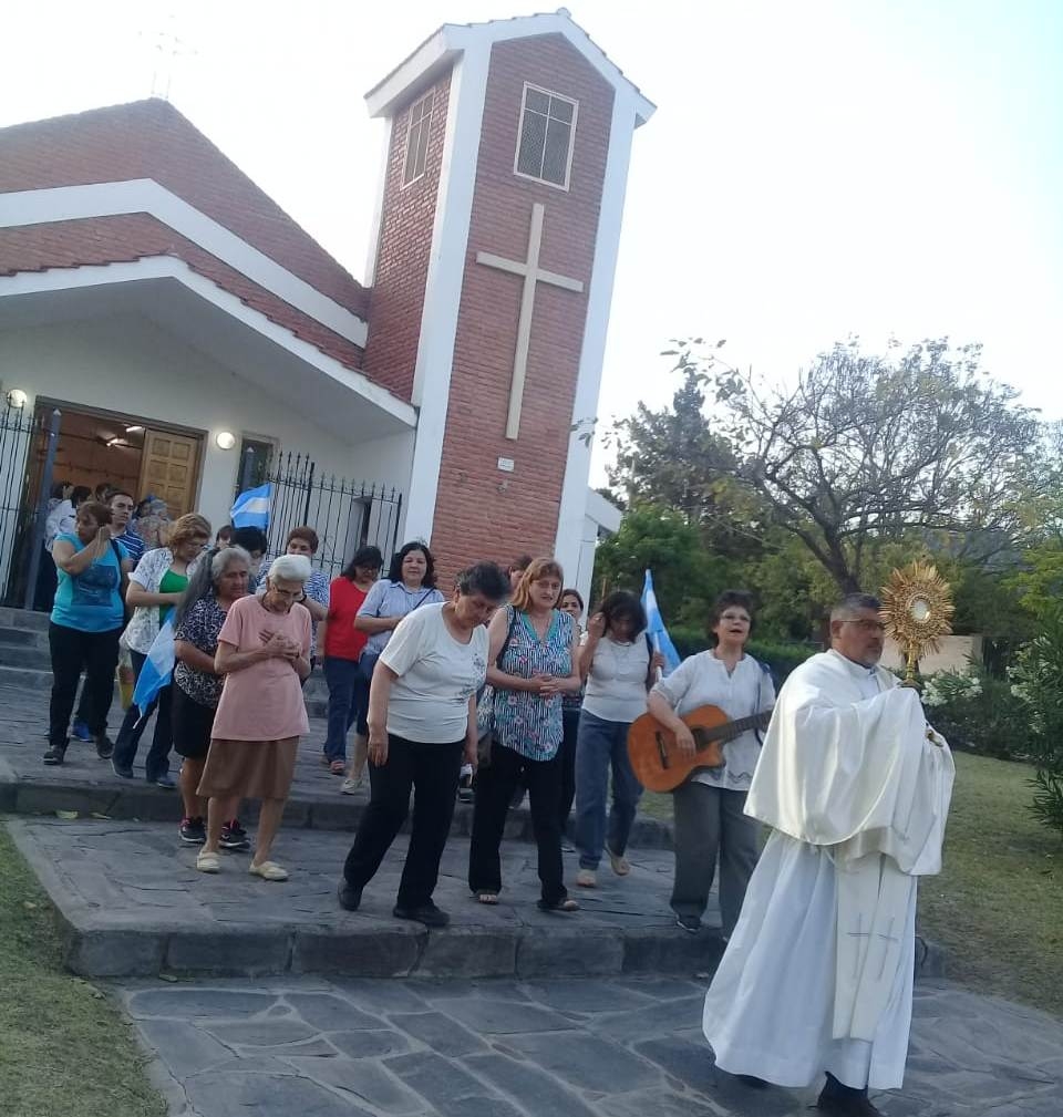 Luego de la Adoración realizada en la capilla situada en Villa Parque Chacabuco, se concretó la procesión con el Santísimo, llevado en alto por el Pbro. Víctor Hugo Vizcarra, párroco de San Roque, jurisdicción que integra esta comunidad.