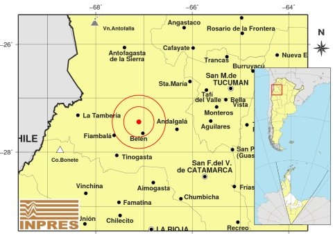 Epicentro: 175 km al NO de San F. Del Valle De Catamarca; 201 km al O de San Miguel De Tucumán; 25 km al N de Belén -27.442 (lat) -67.106 (long)